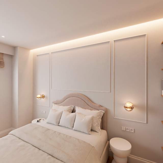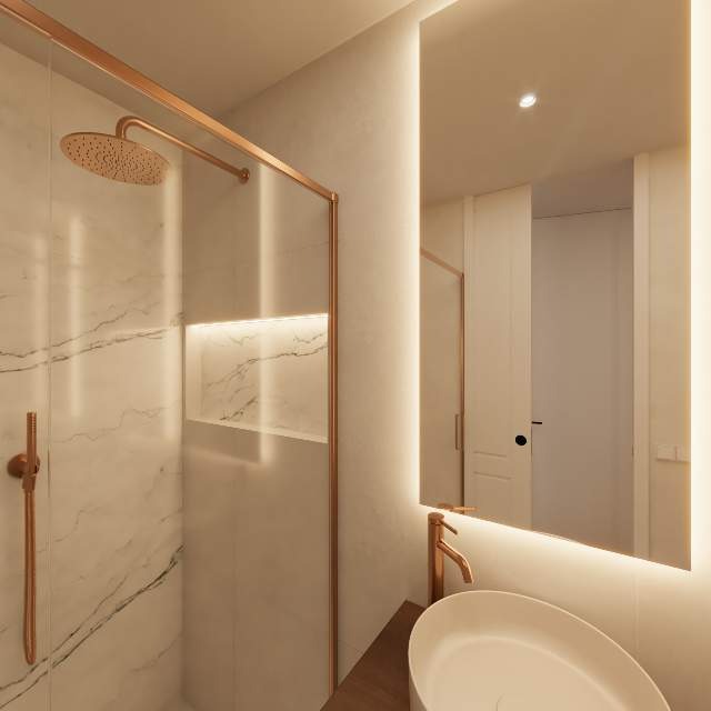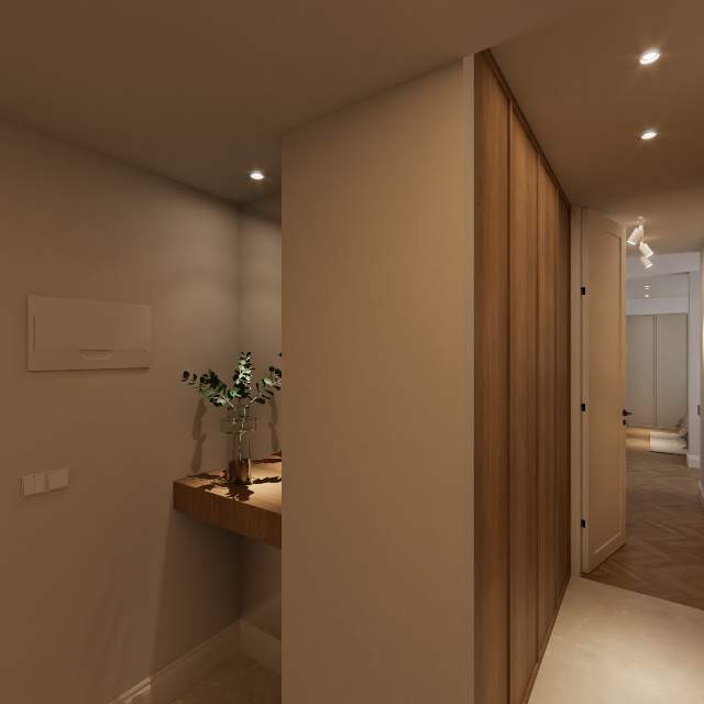 la paleta de color se ha construido sobre tonos neutros, suaves y luminosos, con materiales nobles como la madera de roble y acabados travertinos, que oficia de hilo conductor y que gracias a su orientación Su-Este, inundan de luz cada rincón.